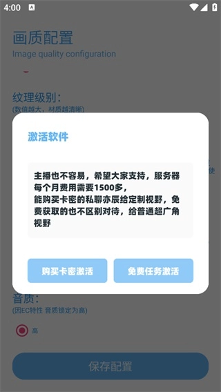6、配置完成后保存配置,系统会提示先激活软件,有两个选择:购买卡密激活和免任务激活,选择其中一个就好。