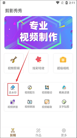 1、在本站安装剪影秀秀,在【剪辑】页,我们可以看到【视频剪辑】、【炫彩特效】、【超级相机】、【去水印】等各种功能,选择【去水印】功能,点击进入;