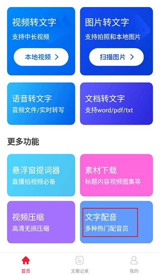 1、在本站安装视频转文字功能。安装完成后,打开本站首页,在首页上找到文字配音功能。