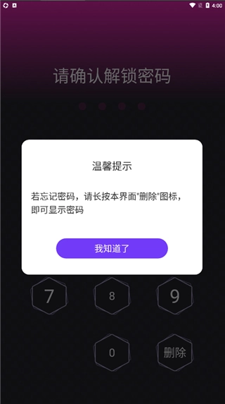 3、若忘记密码,请长按本界面"删除"图标,即可显示密码;