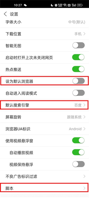 4、当需要将其设为默认游览器和切换搜索引擎或者想添加脚本的时候,都可以进入设置页面,然后点击进行设置。