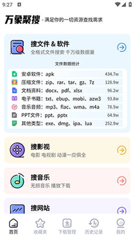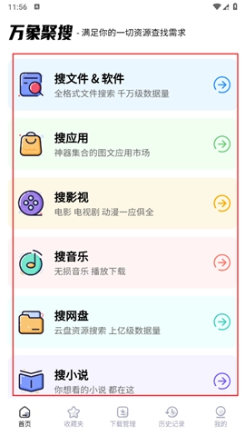 2、当你进入软件,便能看到功能丰富的搜索板块,它支持对文件、应用、影视、音乐、网盘资源、小说等内容进行搜索。