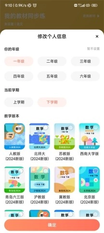 2、在页面中选择年级,选择上学期或下学期以及教材版本,然后点击【确定】。