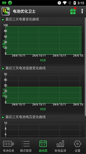 曲线图用于记录电池电量、温度以及电压的变化情况。