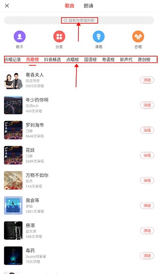 2、之后就可以进入歌曲朗诵界面,下方有热歌榜、抖音精选等多种多样的歌曲可以选择,也可以点击上方搜索框输入自己想要录制的歌曲。