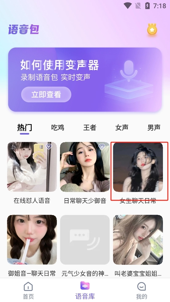 2、进入语音库中将会看到各种不同的语音选择,我们以女生聊天日常语音包为例;