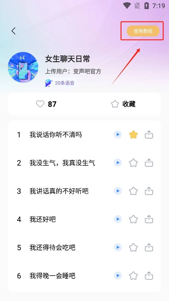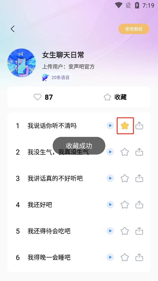 4、遇到需要经常使用的语音可以通过收藏保存下来,随时可以更加快速得找到语音包进行发送;