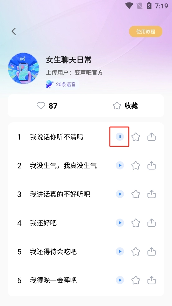 3、进入之后,你会看到一些特定的语音句子,点击播放按钮,就能预览语音播放的内容。