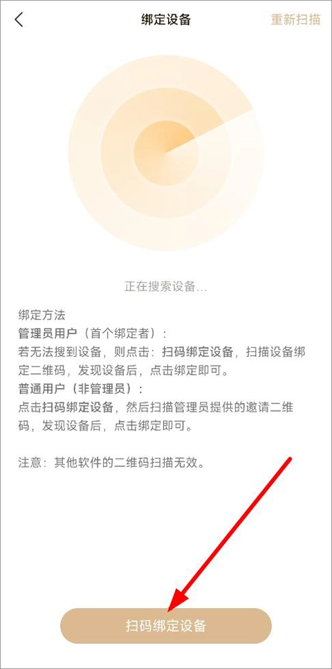 3、成功登录后,便能进行设备绑定,点击扫描以绑定设备。