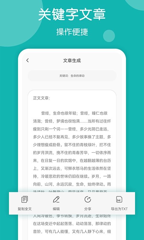 这是一款文章生成器软件,用户在应用里输入关键词,就能生成相关文章,然后可拷贝复制到文档自带的文档编辑功能处进行编辑。
