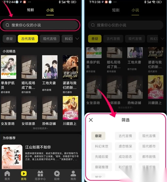 2. 轻点页面最上方的“搜索”,就能输入文字信息,去寻觅心仪的小说。而点击“筛选”,则能够浏览全部分类。