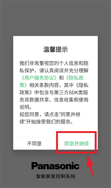 首先安装松下悦适家,安装完成后打开该应用,进入应用界面时,需先同意温馨提示,然后点击继续。