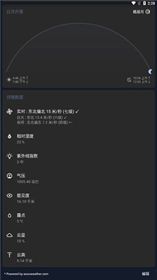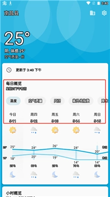 2、在主页往下拉就是刷新,主页上的信息非常齐全,“每日概览”点开就是15日的预报数据,每日概览下面是“小时概览”、“空气质量”、“日月升落”、“详细数据”