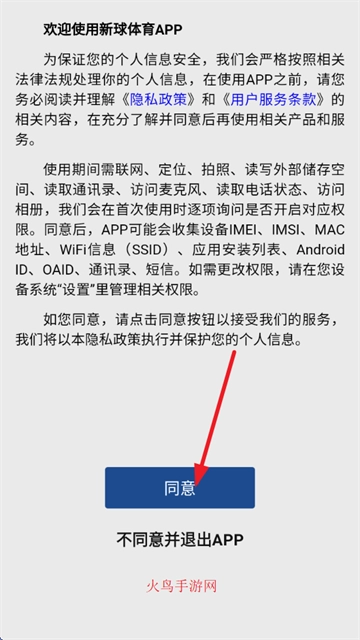 1、首先打开新球体育,阅读并同意《隐私政策》和《用户服务条款》;