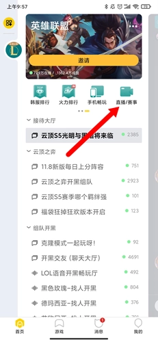 2、然后我们就可以来到这个游戏的相关互动界面,这里有很多的全新内容以及更新界面,这个时候我们点击右上角的【直播/赛事】,就能打开直播的界面。
