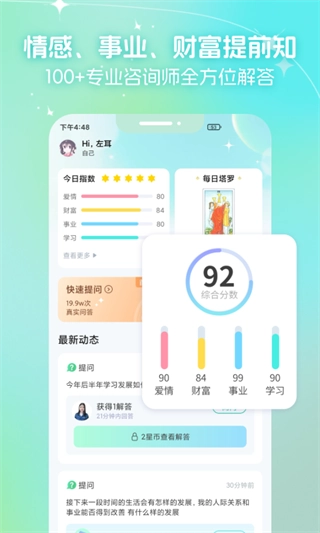 无论是恋爱婚姻中遇到的感情困扰,还是工作事业中遇到的决择问题,所有疑问都能在这里找到解答。汇聚占星、牌阵、心理、星座等多领域的专业咨询师在线24小时为你全面测试与解析星座运势、爱情婚姻、人际关系、事业财富、工作学业等问题,给你幸福指引。