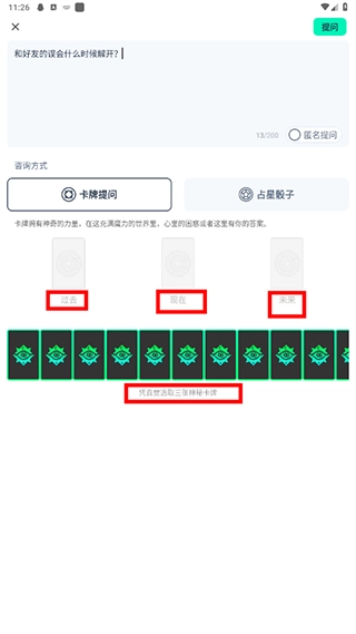 2. 输入你的疑惑,接着随机抽取三张塔罗牌,它们将依次代表你的过去、现在与未来。