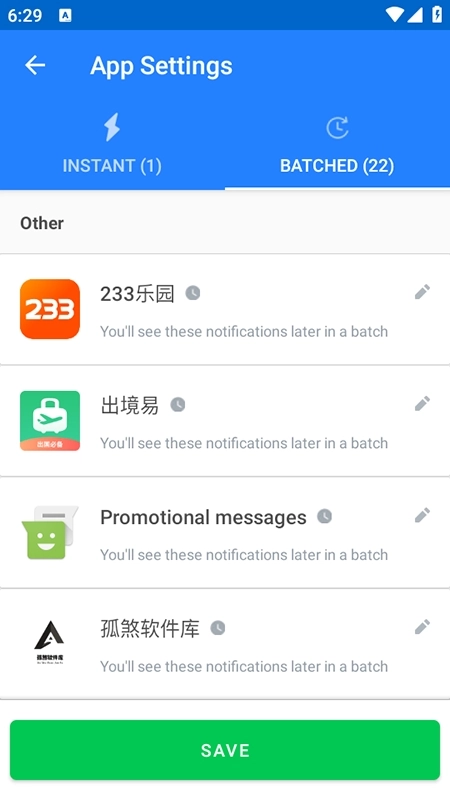 选择要设置的软件,可将其拖入“Instant”即时推送规则或“Batched”批量推送规则,批量推送的软件还能单独设置接收时间,设置完成点击“save”保存。