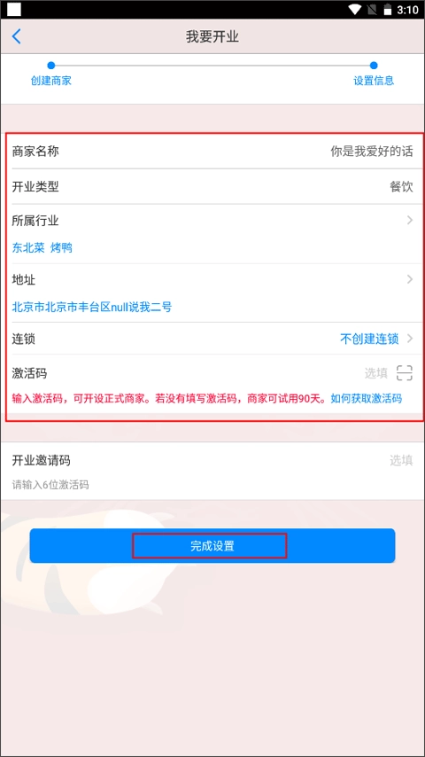 3、这里就要开始填写店铺详细的信息:所属行业、具体地址,选择是否连锁等,最后“完成设置”即可创建成功;