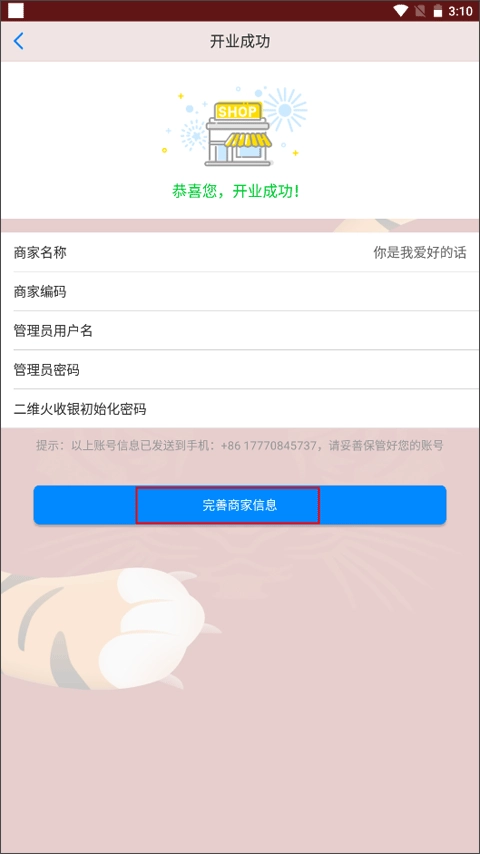 2、填写你的店铺名称、开业类型,点击下方的“创建商家”按钮;