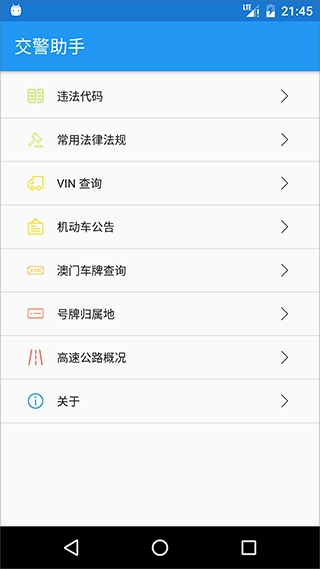 1、第一步,用户在本站下载并安装好交警助手后,打开进入。在此界面,能够进行违法代码查询、常用法律法规查询、VIN查询等操作。