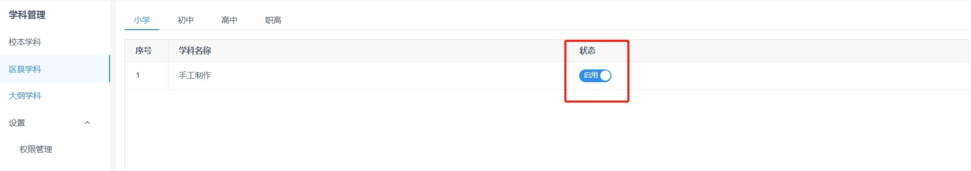 3、大纲学科:数据来源于教育局设置的大纲学科,仅支持各学段下启用/禁用学科状态。