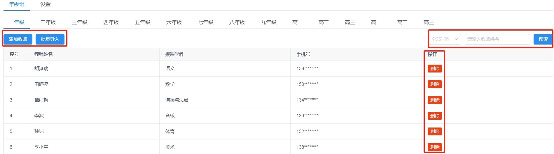 1、年级组:支持单独添加教师、模板批量导入教师、选择学科搜索教师用户和删除教师用户。