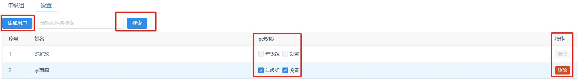 4、设置-权限管理:支持添加/删除权限用户,支持输入姓名搜索用户,支持勾选/取消勾选为用户分配或取消权限。
