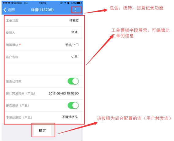 每个工单的详情所展示的内容,均为该工单对应的模板字段。后台能够对字段的可编辑性、可见性进行配置,同时也能对宏的显示与隐藏进行设置。工单详情会依据后台的这些配置,实现完美呈现(可参考帮我吧后台工单相关设置)。
