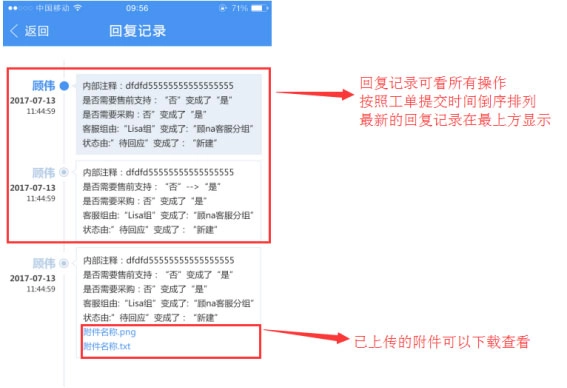 点击回复记录,就能清晰查看到每次工单操作的记录与回复内容,其中每条回复记录所带的附件也能清楚查看。