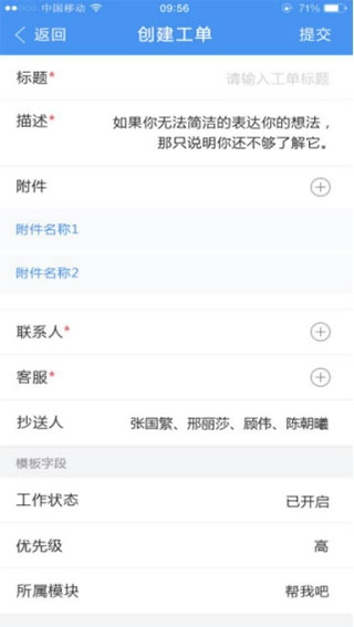 帮呀支持创建工单,先选择模板,然后再填写工单相关信息,工单标题、描述、联系人、客服、抄送人、回复信息、附件以及工单模板相关字段,提交后该工单即可派发出去。