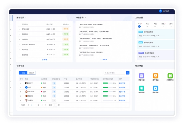 远秋助理全科医生培训系统严格按照助理全科医师培训大纲开发,功能涵盖学员报到、轮转安排、出入科、考试考核、轮转手册管理、360评价、教学活动、考勤管理、师资管理、督导管理等,多年来经国内60多家助理全科医师培训基地广泛使用,系统国功能得全面性、稳定性、实用性得到一致好评。