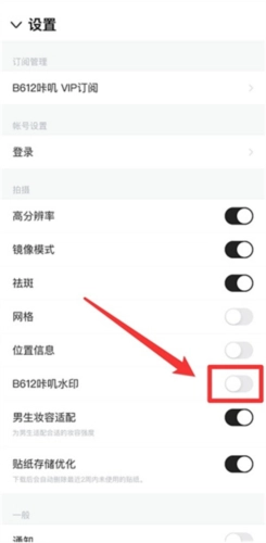 3、在页面中找到“B612咔叽水印”可以看到右边的按钮是黑色的打开状态