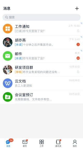 5、方便快捷的手机办公功能,提供了手机通讯录.云文档.会议室预定等功能。
