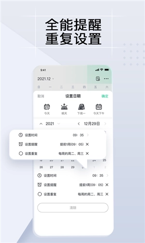 2、提醒:一次设置,自定义多闹钟提醒、日程重复,不会错过重要的日程。