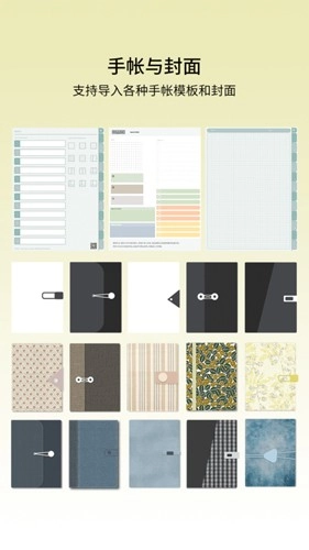 有无界笔记、普通笔记、PDF笔记、手账,支持导入PDF、PPT、Doc、JPEG、PNG等多种文件格式插入,GIF、图片、音频、超链接等多种常见内容,多种纸张模版和封面选择,可自定义纸张模板、封面模板、贴纸。