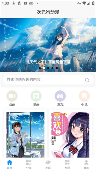 次元狗动漫免费版,这是一款能让你免费观看动漫的手机软件。它整合了海量的动漫资源,还具备智能搜索功能,同时在便捷性与个性化管理方面表现出色,就像一个装满ACG资源的“百宝箱”。这里面汇聚了国内外的热门日漫、精彩国漫以及欧美动漫等丰富多样的资源,新番、剧场版、漫画、轻小说甚至游戏等各类ACG内容都囊括其中,能够全方位满足你多样化的需求。