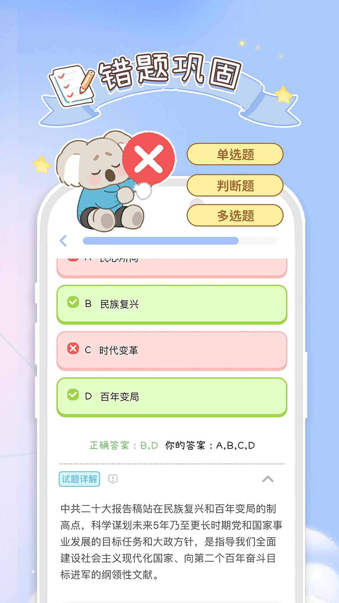 6. 在做题时,重要的错题会自动被收录到“错题本”中,你能够按照考试类型或者知识点进行分类,然后重新做这些错题。