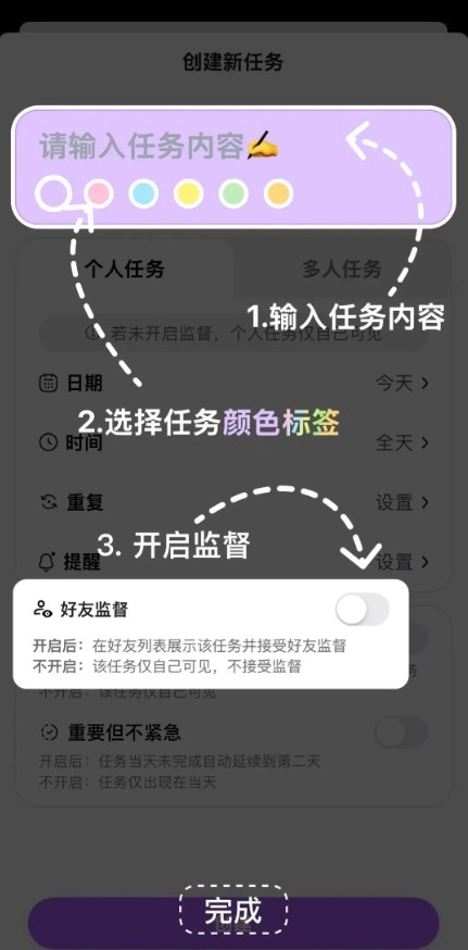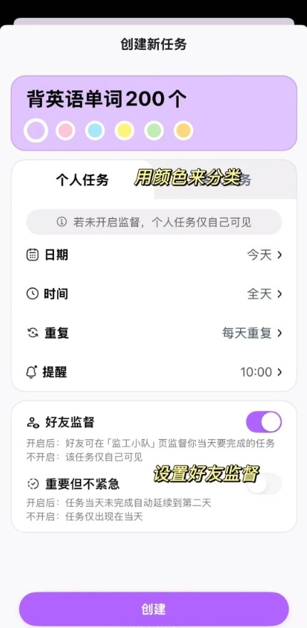 2. 可进行个性化的任务创建,且能够依据个人习惯自主设定任务背景。