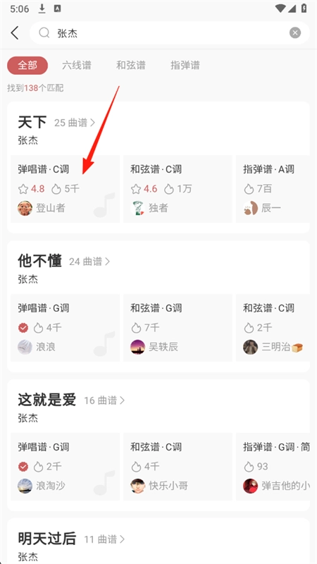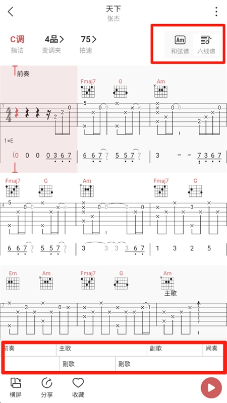 5、来到乐谱界面,在此界面上方能够切换显示和弦谱或六线谱,界面下方则能够快速跳转至主歌、副歌等位置。