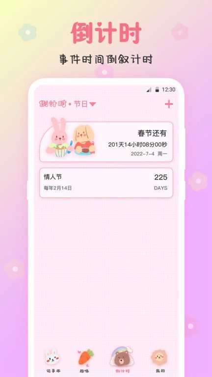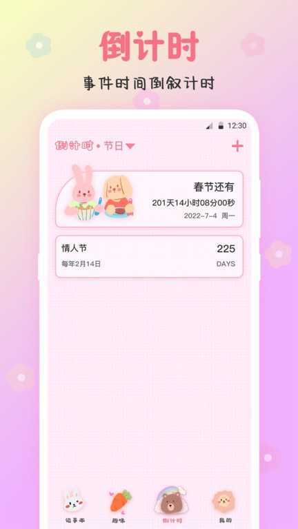 3、充满趣味且具实用性的内容,设有倒计时功能,以倒叙方式对事件时间进行计时。日记背景丰富多样,涵盖各类不同风格。