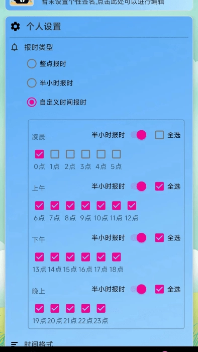 当您选择自定义报时模式,就能勾选特定的小时进行报时,而且针对清晨、上午、下午、晚上这些不同时间段,可分别设置是否开启半点报时功能。