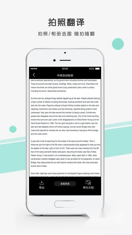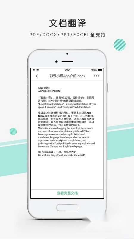 点击首页右下角的“文档”按钮,上传手机中的你所需要翻译的文档(PDF / docx / doc / PPT / xls 任一格式),选定语种,即可获得双语对照的翻译结果!使用同一账号登录,在电脑和手机上均可浏览和