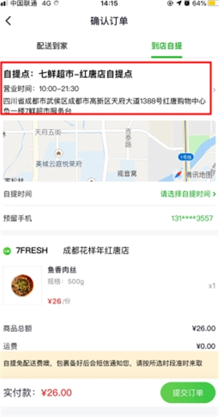 2、选择我们目标的七鲜超市,能看到相应的营业时间与详细地址信息,确认无误后下单就能到店自提啦