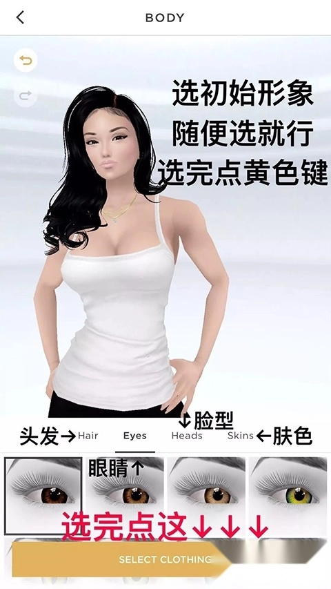 4、选了人模之后选初始形象,随便选,能让你现在选的东西都会一直在你衣柜里,选好之后点击黄色键进入下一个页面。