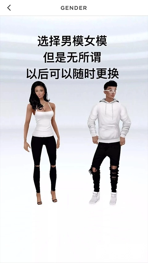 3、完成注册后,需要选择男模或女模,但这并非关键,后续可随时在更衣室更改。此处所选的人物模型仅决定你首次进入游戏时的性别,点击相应人物即完成选择。