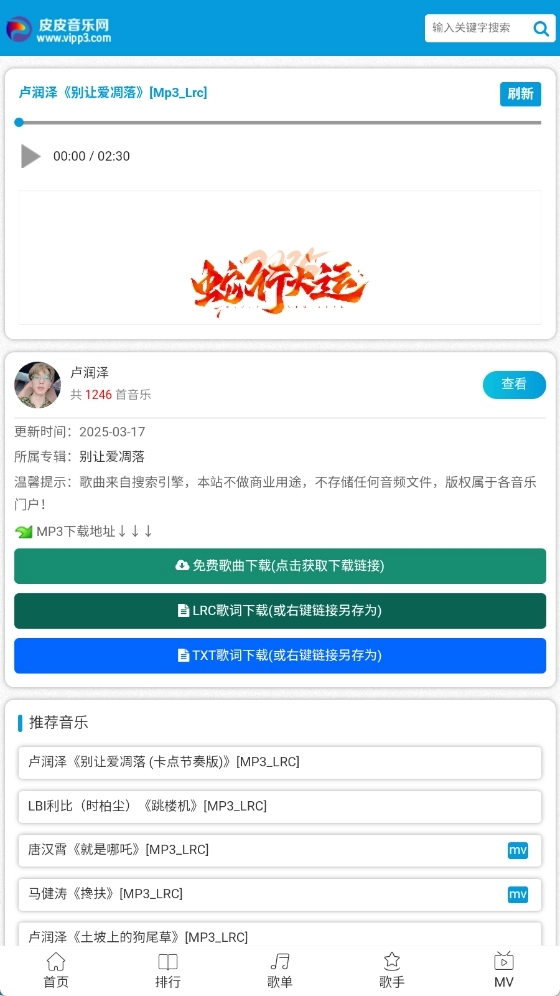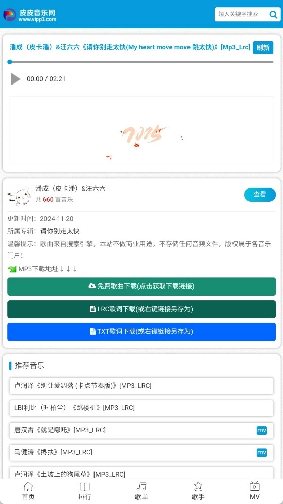2、界面的设置非常简单,推荐给用户不同的音乐歌曲,简单进行音乐播放