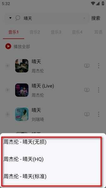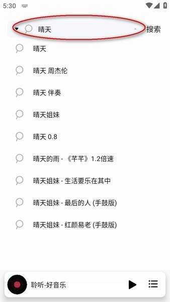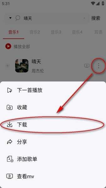搜索你要的歌曲,可以搜索歌名或者歌手,比如晴天;