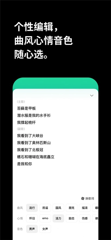 丰富的自定义功能,可以随心选择曲风、心情和音色,打造专属个性化音乐。