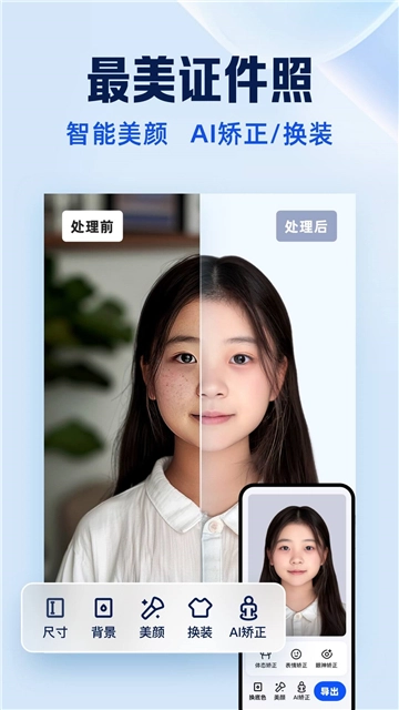 4、拍证件照,出门办事必备,自拍抠图换底色,智能美颜、换装生成绝美证件照,多种专业规格任意挑选,再也不跑照相馆。